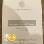 Der Münzkern zeigt verschiedene Sportelemente, darunter Bälle aus unterschiedlichen Sportarten, mit stilisierten Netzen als Hintergrund. Sie alle haben einen dynamischen Stil, der Bewegung und Energie ausstrahlt. Oben steht die Aufschrift „Jocs dels Petits Estats d’Europa“ und unten „ANDORRA 2025“.